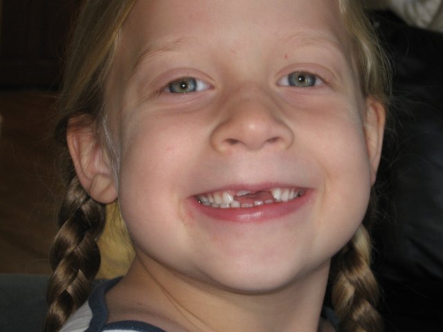 | Analesse shows off her missing front teeth. During their stay in Austin, Lesse's remaining front tooth was irrating her enough that she wanted the tooth/string/front-door procedure. Mother Ann performed the procedure flawlessly. |