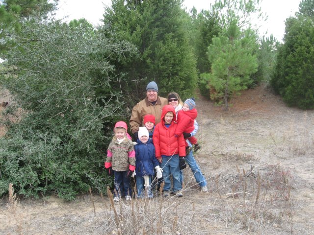 The St.John's pose in front of this Christmas tree-to-be before they start the work of sawing it down.
